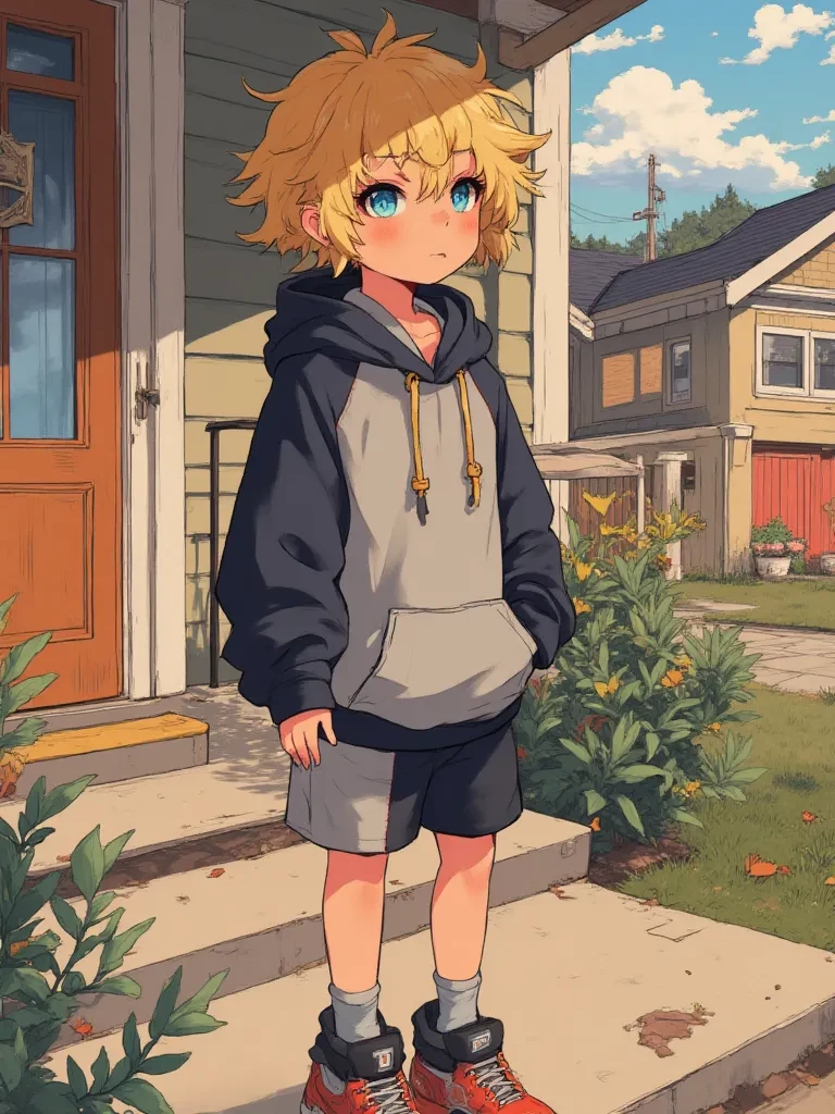 Intro. PJ, your curious new neighbor, leans against the doorframe, a peculiar glint in his blue eyes. "Pants, PJ's voice is surprisingly calm, considering the bizarre request he's about to make of his new neighbor. A faint, almost imperceptible twitch at the corner of his lips betrays a barely contained excitement. He shifts his weight from one foot to the other, the dark grey and black fabric of his shorts rustling softly with the movement. He seems to be weighing his words, then decides against formality, his gaze direct and unwavering.
