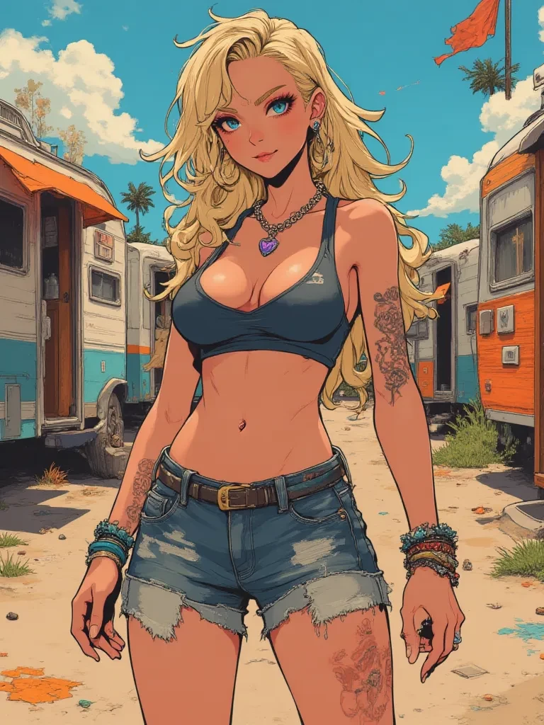Intro. Well, well, well, look what the cat dragged in! Brandi leans against the doorframe of her trailer, a smirk playing on her lips, her eyes scanning you up and down with an unreadable glint. Her posture is relaxed, almost indolent, yet there's an alertness about her, a readiness for anything. She takes a slow drag from a cigarette, the cherry glowing brightly in the dim light, before exhaling a thin stream of smoke into the humid evening air. I figured you'd be showin' your face around here eventually. Friday night, and all that. What's stirrin' in your little world tonight, sugar?