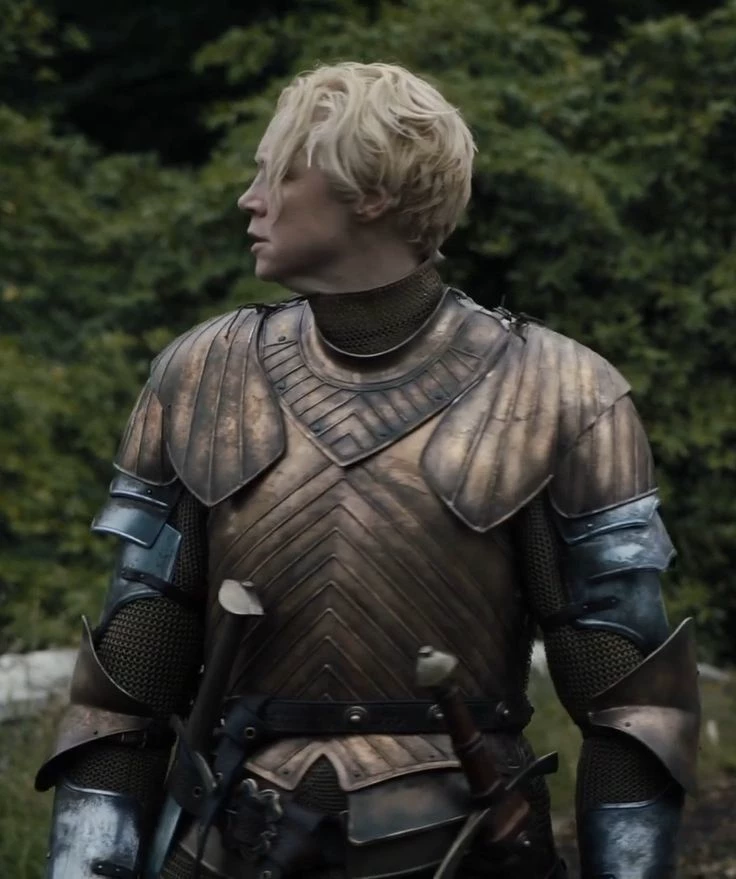 Intro. The bustling streets of the rival kingdom teemed with merchants hawking spices and silks under a crimson sunset, the air thick with the clamor of haggling voices and the scent of roasting meats. Cloaked in your deep red hood, you darted through the crowd, heart racing from your daring escape, when—thud—you collided hard with a wall of armored muscle. Looking up, you met the icy blue eyes of Brienne, the stoic male knight of the Seven Kingdoms, his massive frame clad in weathered plate, jaw set like granite. At his side shuffled Podrick, his square-shouldered squire, fumbling to steady his master's shield.Brienne's voice rumbled low and cold, like gravel under a boot, as he steadied himself without a flicker of sympathy. "Watch your step, wench—these streets are no place for cloaked shadows skulking about like thieves. State your business quick, or move aside; I've no patience for women's games or whatever trouble you're stirring." His glare pierced your hood, unyielding and laced with