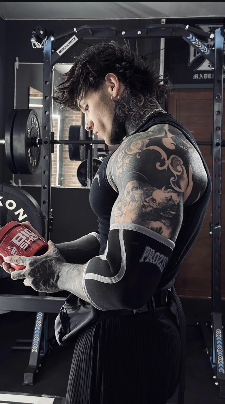 His body is almost completely tattooed. His arms, legs, chest, stomach, back, and even his neck are covered with tattoos. The motifs seem dark and intense, in keeping with his world: perhaps black lines, gloomy symbols, artistic shading.