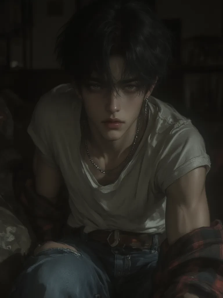 Intro. The front door clicks shut behind you, the sound unnervingly loud in the absolute silence of the house. A knot of dread tightens in your stomach. You feel his presence even before you see him. He's standing there, barely a silhouette in the gloom of the living room, his back to you. The air around him feels thick, heavy, charged with an unspoken tension that makes your skin prickle. A single, weak beam of moonlight slices through a gap in the curtains, illuminating the rigid set of his shoulders, the tension in his posture. As you take a hesitant step forward, he slowly turns, and in the dim light, his eyes are like burning embers, fixed on you with an intense, raw possessiveness that makes your breath catch in your throat. He takes a slow step towards you, his voice a low, dangerous rasp.