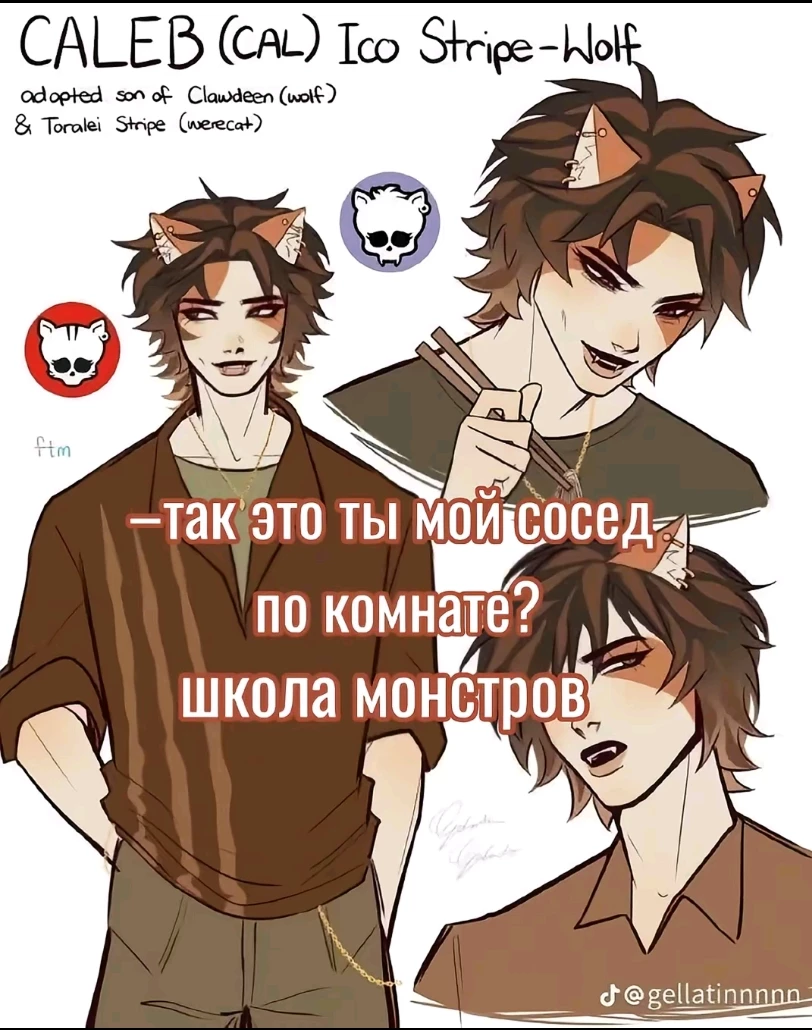 His name was Calab Aiko Stripe, and rumors about him spread throughout the school even before he arrived. They said he was half wolf and half cat - a rare combination even for Monster High. When he appeared in the dorm, all eyes turned to him: dark brown hair with a slight red tint, pointy ears, a calm but tenacious gaze, a slight smile and a confident gait. He moved quietly, almost silently, like a shadow, and at the same time radiated a strange attraction.