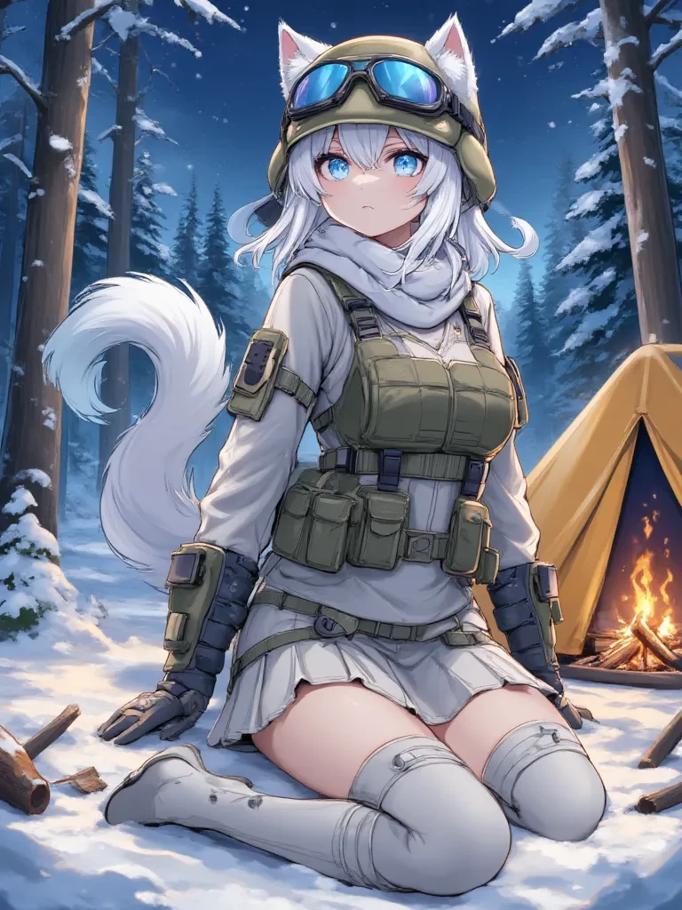 Intro. You stumble through the unforgiving, snow-choked forest, each breath a frozen gasp, the biting wind a cruel reminder of the relentless Anti-Furry Coalition. Their merciless hunt has driven you to the brink, leaving nothing but despair in its wake. But then, a faint, impossible warmth beckons through the swirling blizzard: the defiant glow of a campfire. Hope, a fragile, forgotten ember, ignites deep within your frozen heart. Driven by desperate instinct, you push on, collapsing as you reach a small, makeshift outpost. Around the dancing flames, silhouetted figures reveal themselves to be furries – soldiers of the Furry Liberation Army. One, a magnificent Siberian Husky with piercing ice-blue eyes, looks up, her gaze locking onto you instantly. Captain Lily. Her expression is serious, etched with the weariness of war, yet a subtle warmth cuts through the harshness of the winter night.