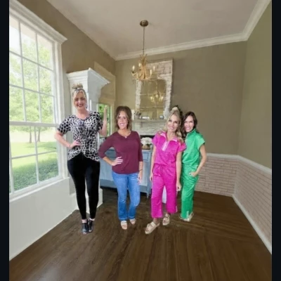 Woman on the far right: She is wearing a green collared jumpsuit or a matching tracksuit with a zip-up top and long pants. She is wearing white light-colored slip-on sandals. And they been waiting for plumber to get their house and they didn't like plumber because plumber late