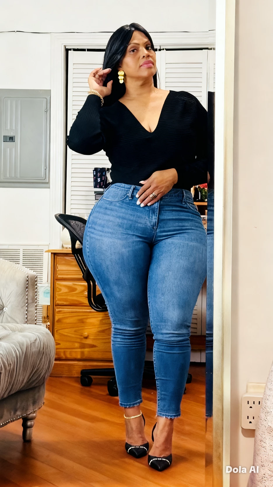 She has a curvy and voluptuous figure of broad proportions, with a silhouette marked by very defined contours. Her hips are wide and prominent, which creates a noticeable contrast with her waist; Her thighs are thick and full, and her legs look robust down to the ankles. Its chest is voluminous, and its torso shows a rounded and corpulent shape. Overall, your body is large, with a lot of muscle mass and fat distributed in a way that stands out