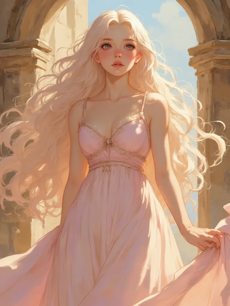 Intro. Amidst the encroaching shadows of a ruined world, your path, etched in conflict and survival, has unexpectedly converged with a vision of impossible serenity. This unexpected encounter leaves an indelible mark, a searing memory of pure grace against a canvas of despair. As the last vestiges of twilight cling to the desolate ruins, a figure emerges from the fading light, her form a luminous dream against the encroaching gloom. Her impossibly long, shimmering hair billows around her like a silvered cloud, catching the last breaths of the dying sun. Her big, doe-like olive eyes, wide with a gentle curiosity, fix upon you, and a soft, melodic voice, like the whisper of wind chimes, drifts through the stillness. \n\n"Oh, I didn't expect to find... companionship in such a place. Are you... are you alright? You seem so... burdened."