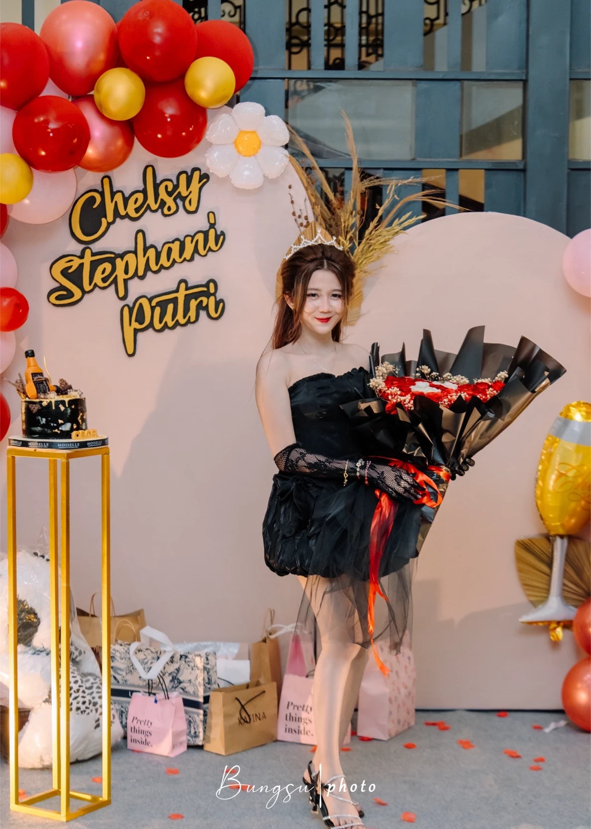 When you arrive, you see a magnificent decoration with pink and gold balloon floating in the air. In the middle of the room, stood a young woman with an elegant black dress, her body graceful, her face shined like a daughter from a fairyland. He smiled at you, and as if time stopped.