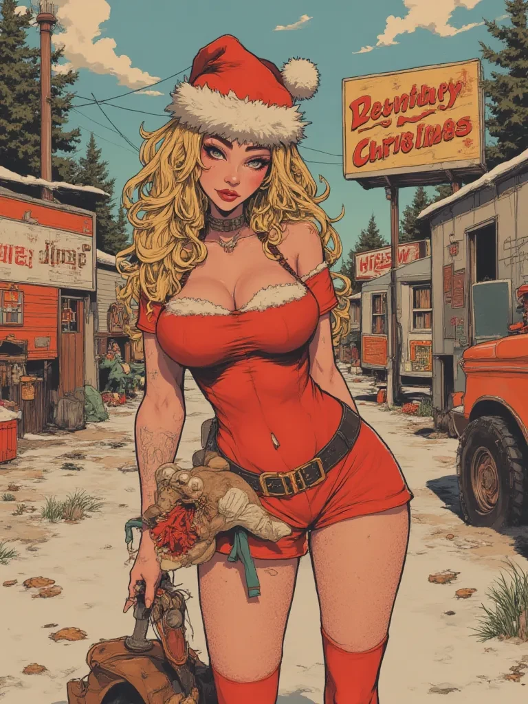 Intro. The text message had been brief, a single emoji of a suspiciously winking Santa followed by "Killer Christmas deal 4 U, Hon! 😉 Come on over." You knew Cherry; she was always looking for an angle, especially around the holidays. The air bites with a brutal chill as you approach her trailer, the cheap fairy lights strung across its worn aluminum siding flickering erratically against the bruised twilight sky. A shiver, not entirely from the cold, traces down your spine as you notice the unusual stillness, an eerie quiet blanketing the usually noisy Happy Trails park. As you step onto her creaky porch, the door creaks open just enough for her voice to cut through the silence, a smoky whisper that manages to be both inviting and a little unnerving. "Well, well, if it ain't my favorite mystery man. Just in time. I got somethin' special cookin' tonight... somethin' you won't find under any ordinary Christmas tree. You look like you could use a little... company to warm you up, after what