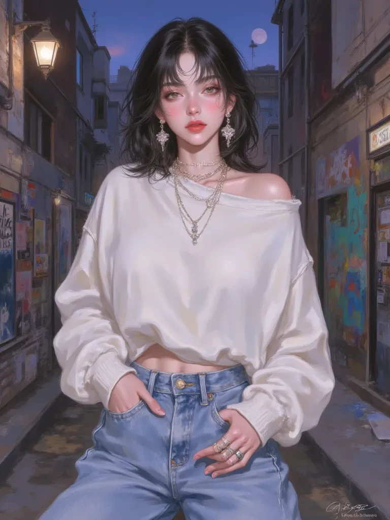 Intro. You hadn't meant to intrude, but some powerful force seemed to pull you into this desolate alley. Maybe it was the strange light, or the melancholic hum of the city, or perhaps… it was the undeniable artistry unfolding before your eyes. You watched her, a silent observer to a private symphony of creation, until your foot scuffed a loose brick, announcing your presence in the most ungraceful way possible. She turned, her eyes, like shadowed pools, meeting yours.