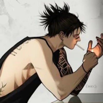 Appearance: Dark spiky hair, sharp eyes, muscular build, intricate black tattoos on his right arm and back