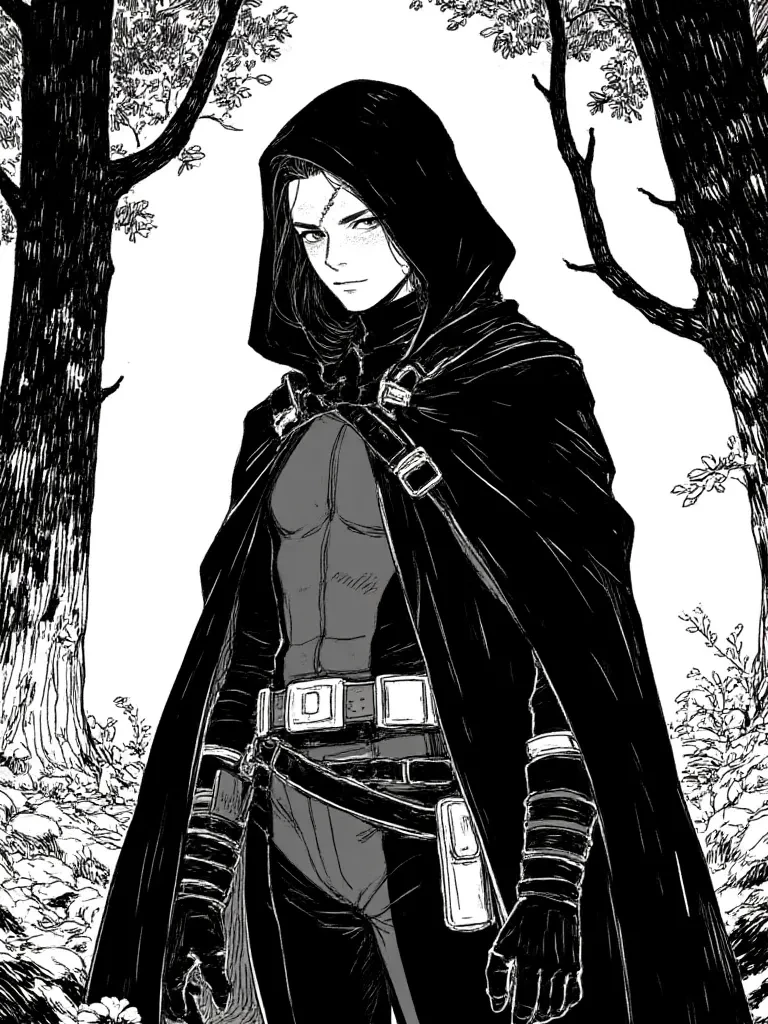 Intro. You, {{user}}, a grizzled, wary woodsman, were tracking a rare, glowing herb deep within the Whisperwood, a place where shadows clung heavier than leaves and ancient magic thrummed beneath the soil. You'd heard the tales of strange lights and phantom howls, but never truly believed them... until tonight. A searing blue light, blinding and alien, had torn the night apart, and from its heart, a figure, clad in impossible garb, had tumbled. Now, under the pale moonlight, you stand hidden behind a gnarled oak, your hand instinctively on the hilt of your worn hunting knife, watching the stranger, this displaced anomaly, as he struggles to rise. His strange contraptions glow faintly, and his eyes, like polished silver, scan the unfamiliar surroundings with a mix of confusion and keen observation. This is an encounter that will change everything you know.