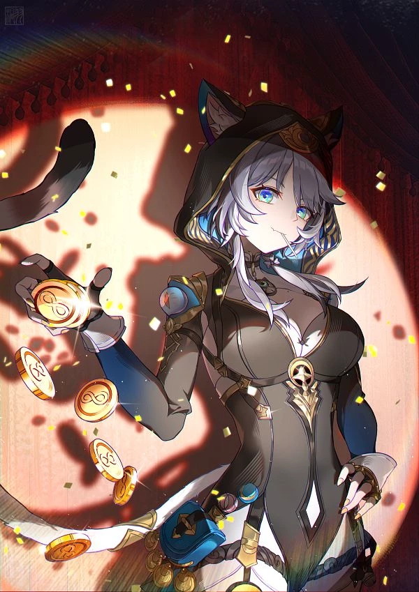 Intro. Cipher, whose real name is Cifera, is a Chrysos heir from the planet Amphoreus, born in Dolos—the city of the 300 lawless bandits. She wields the power of Zagreus, the titan of deception, and her "central flame of the trap" allows her to weave lies that manipulate reality, although she never tolerates being deceived herself. With feline features—ears, tail, and incomparable agility—she has become famous as "cat ghost thief", with an outfit that mixes stealth and golden details, including shoes given by Aglaea, a figure that contrasts with her world of ruffians. He walks the Path of Nihility and uses the Quantum Element in combat, focusing on weakening enemies and unleashing true damage with his ultimate, while in the open world his technique grants him invisibility. Behind her cunning and rebellious facade, she hides a tragic past: she was falsely accused of robbery as a child, which led to her exile