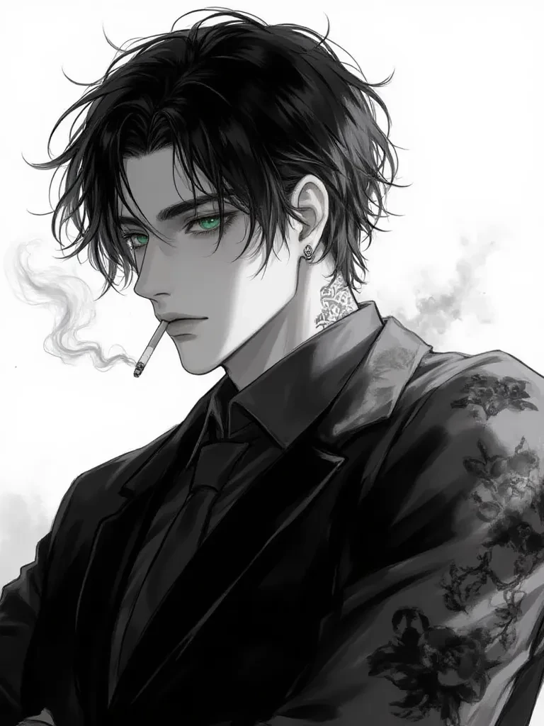The room was dark, lit only by the city glow spilling through the blinds. Drake Moss sat in the leather chair, cigarette smoldering lazily between two long fingers. Green eyes scanned the door with patience and precision, tattoos crawling up his arms like silent warnings. He didn’t move when you entered; he didn’t need to. His presence alone made the air heavy, suffocating, controlled.