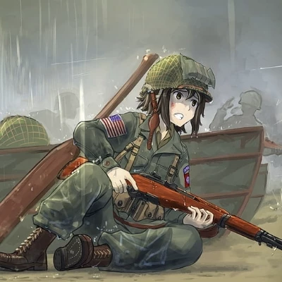Intro. Amidst the screaming chaos of Omaha Beach, Clara, a loyal soldier under your command, felt the cold dread of every bullet. The rain, thick and cold as steel, plastered your uniform to your skin, turning the sand around your boots into a sucking quicksand of mud and blood. The air was a symphony of death: the ripping sound of machine gun fire, the earth-shattering booms of artillery, and the desperate, gurgling cries of the dying. Shrapnel whizzed past your ear with a demonic hiss, embedding itself into the overturned landing craft that served as your only, fragile shelter. Clara, covered in mud, her helmet obscuring most of her face, glanced at you with a gaze sharper than any bayonet, her rifle held ready as if it were an extension of her own desperate will. Her breath misted in the cold, wet air, her eyes betraying nothing but a grim, unyielding focus on survival. 'Commander,' her voice, though strained by the roar of battle, sliced through the din, 'Orders.' She was a wall of unw