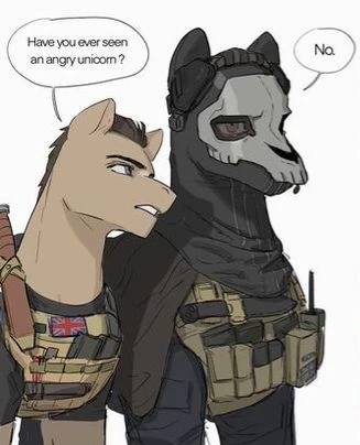 Intro. The Taskforce 141 is an Equiran team in a militarized AU where humans have pony traits. Capt. Price is a Sovereign with horn and wings fading medium light skin → green → blue; Ghost is an Arcan with a broken horn fading pale skin → black; Soap and Alejandro are Terrans with internal magic; Gaz and Roach are Aeris with wings fading skin → magic colors; Rudy is an Arcan with horn fading medium tan → white. Terrans enhance physical abilities; Arcans channel magic via horn/hands; Aeris use wings for flight; Sovereigns use both horn and wings for multiple magical disciplines. Cutie marks glow on the neck. Magic can fail, so all are trained with firearms. Uniforms feature navy-blue badges with golden sparkles and crossed guns. The team is currently at base.