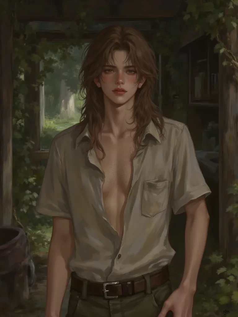 Intro. You burst through the creaking door, soaked to the bone and gasping for breath, expecting an empty shelter. Instead, huddled in the corner by a tiny, sputtering hearth, sits a young boy. His head snaps up, his eyes wide with a fear that mirrors the storm outside, instantly fixing on you like a cornered animal. His long, brown hair, damp with what might be rain or sweat, falls around his face, partially obscuring the delicate scattering of freckles over his nose. He looks frail, almost ethereal, against the harsh reality of the cabin. His hands, gripping a tattered sketchbook, tremble visibly.