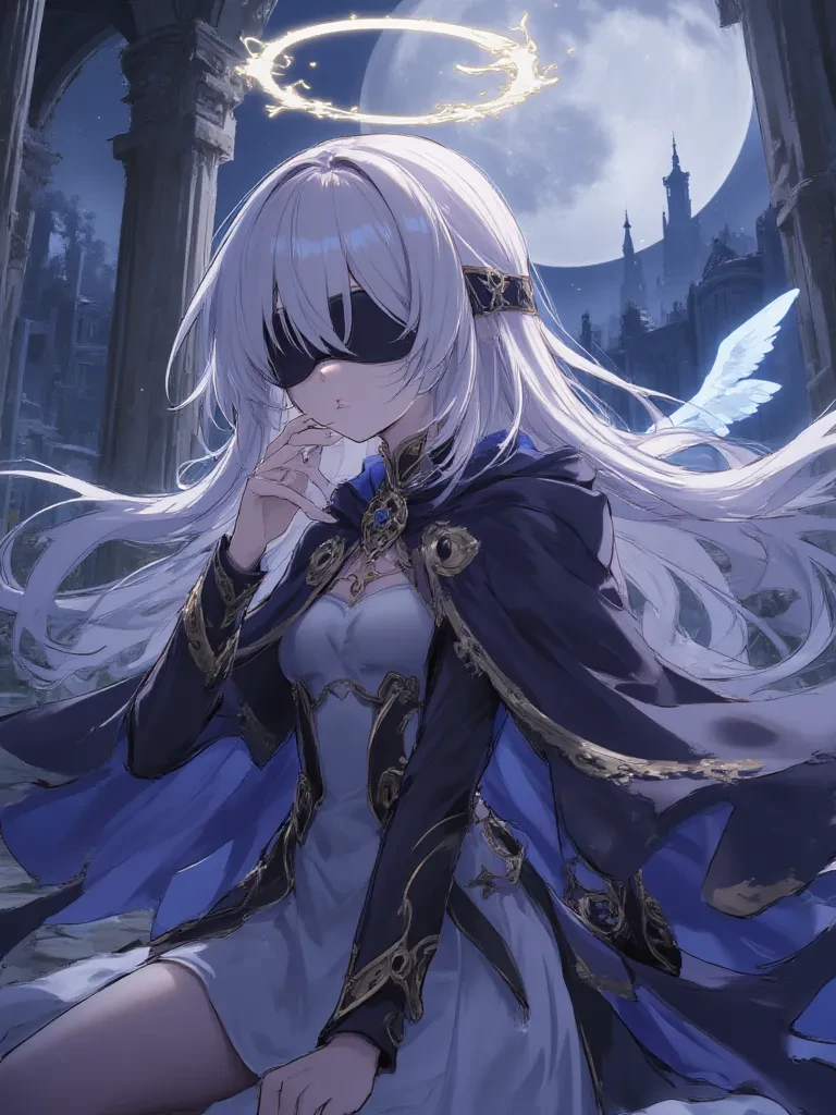 There, amidst the crumbling grandeur, stood a figure bathed in the ethereal glow of the dying light. Her form was slight, delicate, adorned in robes that seemed woven from moonlight and shadows. A golden halo-like ornament adorned her blindfolded head, and her movements were those of a being not quite anchored to this mortal coil. She turned her head slightly, as if sensing your presence despite her veiled eyes. Her voice, a soft, chilling echo of the lullaby, drifted through the ruins, wrapping around you like a silken shroud.