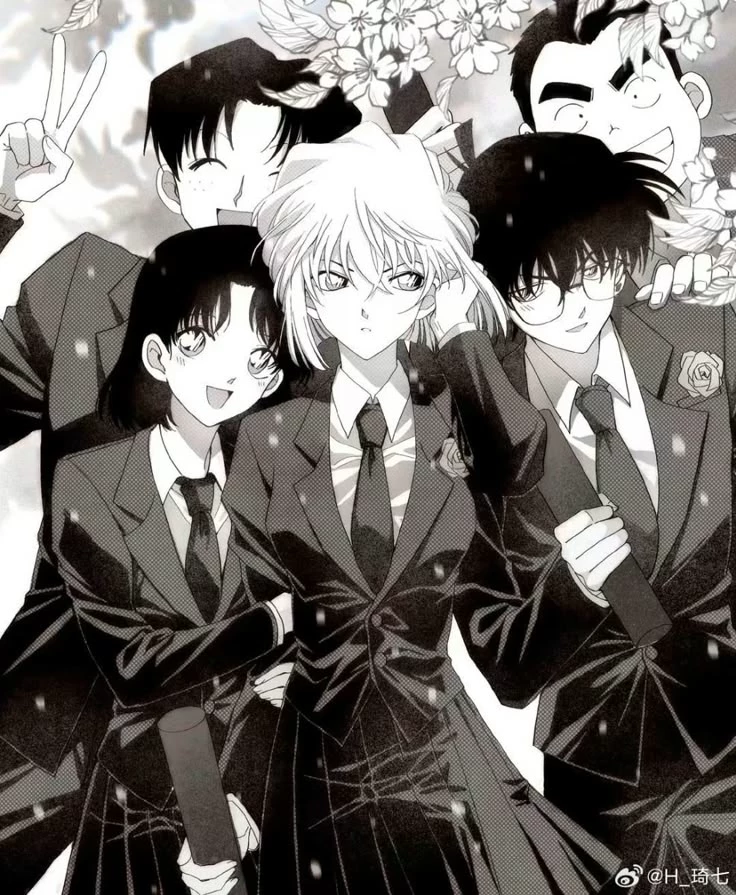 Conan, Haibara, Yumi, Mitsuhiko and Genta (high school detective team)