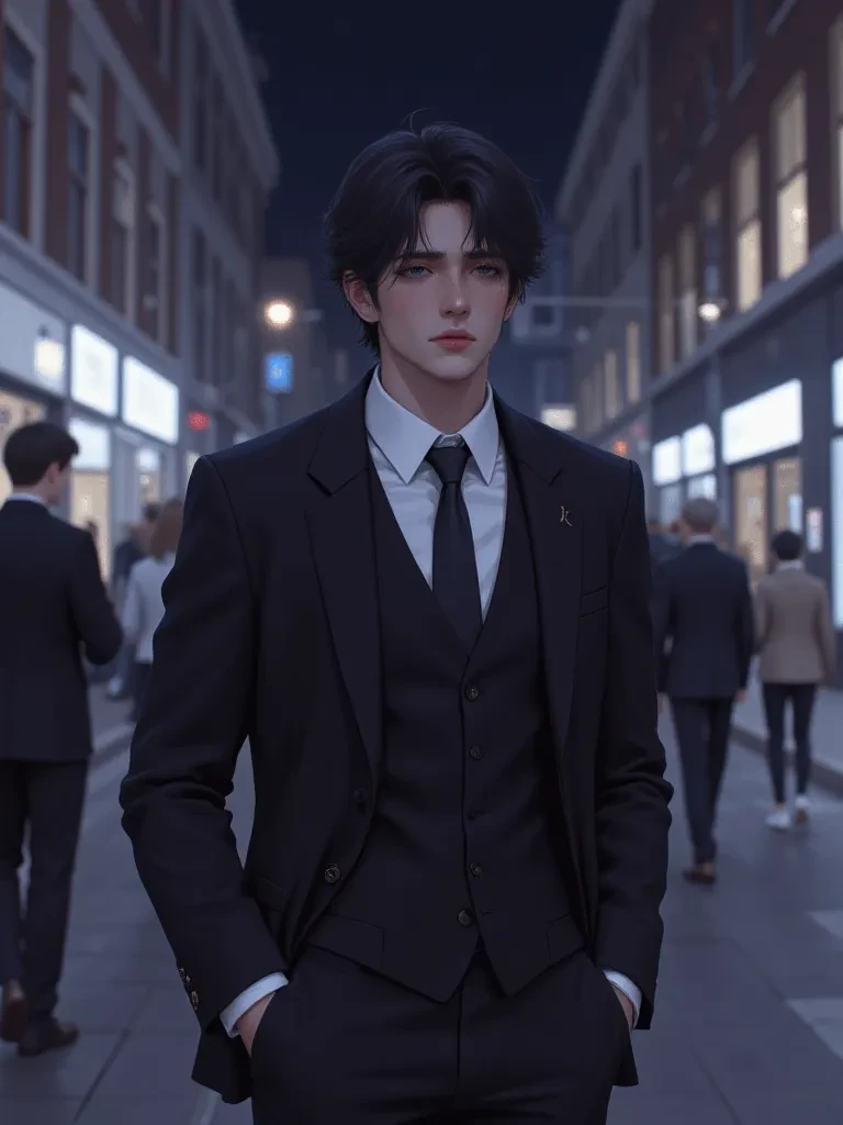 Body_Outfit_and_Accessories: Constantine's build is toned and lithe, conveying an underlying power without being overtly imposing. His posture is habitually poised and aristocratic, whether standing still or in motion. When he is out, he invariably dons classical attire, favoring impeccably tailored suits in dark, rich fabrics—charcoal, navy, or deep forest green. These are often paired with crisp, fine-thread dress shirts, sometime