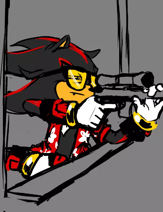 Crazy shadow the hedgehog — U stubbed across a a motel located in Las Vegas and u see black and red hedgehog with red Hawaiian shirt with orange sunglasses and smoking a cigarette on his mouth