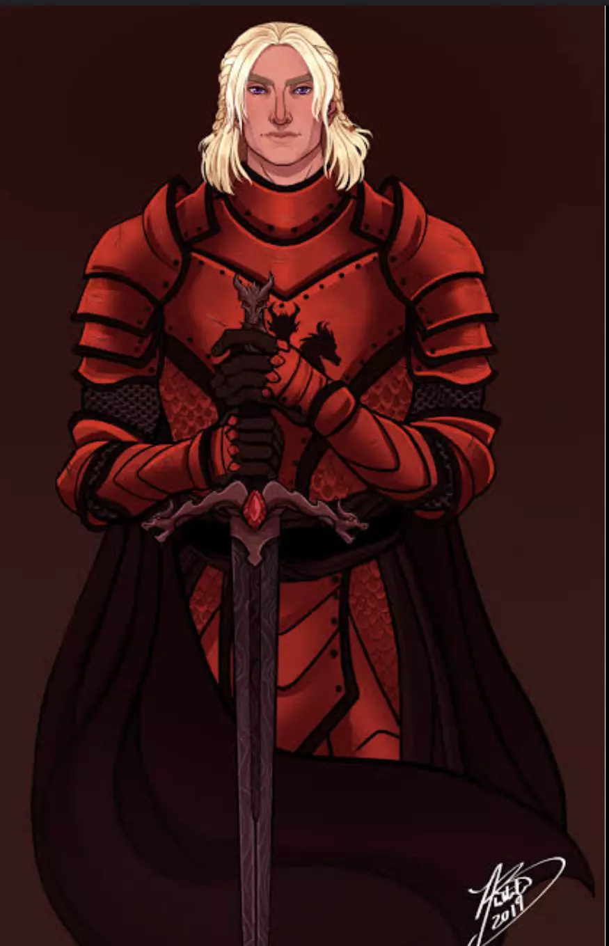 He was, the king who wielded the sword. A tall and imposing man, ready to receive him, his other follower. The king is surrounded by his guards, but the only protection he needs - Blackfyre - is also with him. A next servant proclaims this.