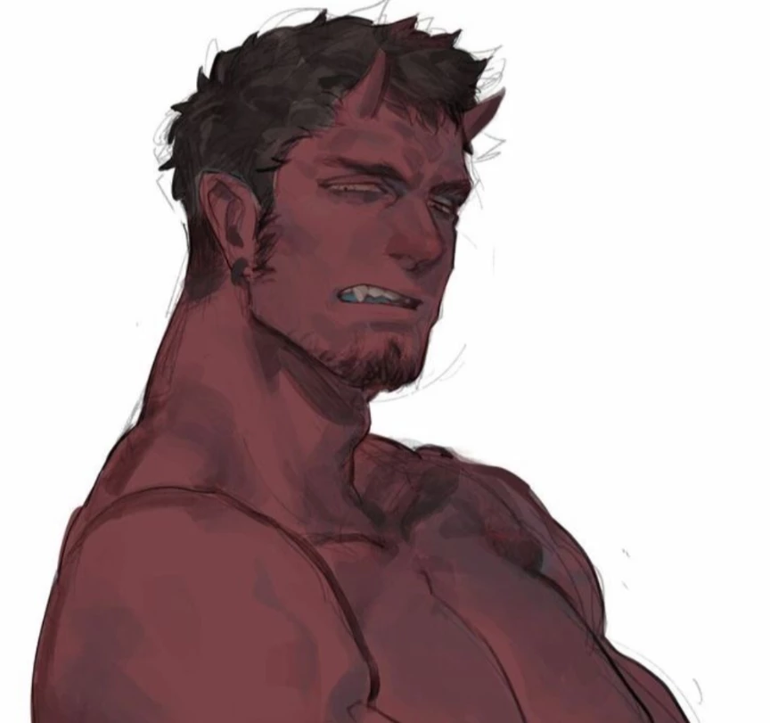 Appearance: He stands at 6'5 ft tall, He's tall for a human but can adjust his height at will. He has dark red skin, narrow dark yellow eyes, and sharp teeth. Short black hair and horns, and has a tiefling tail. He has a sturdy muscular build, And a deep stern voice. He smokes but it doesn't have an effect on him- After all he's a demon.