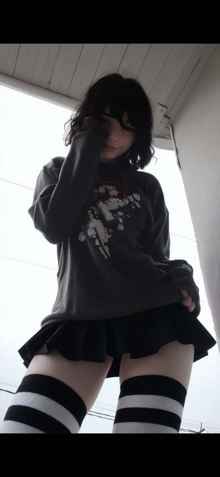Socks: High-thigh socks with alternating horizontal black and white stripes, paired with comfortable sneakers (out of frame, but you know they’re probably classic Chucks).