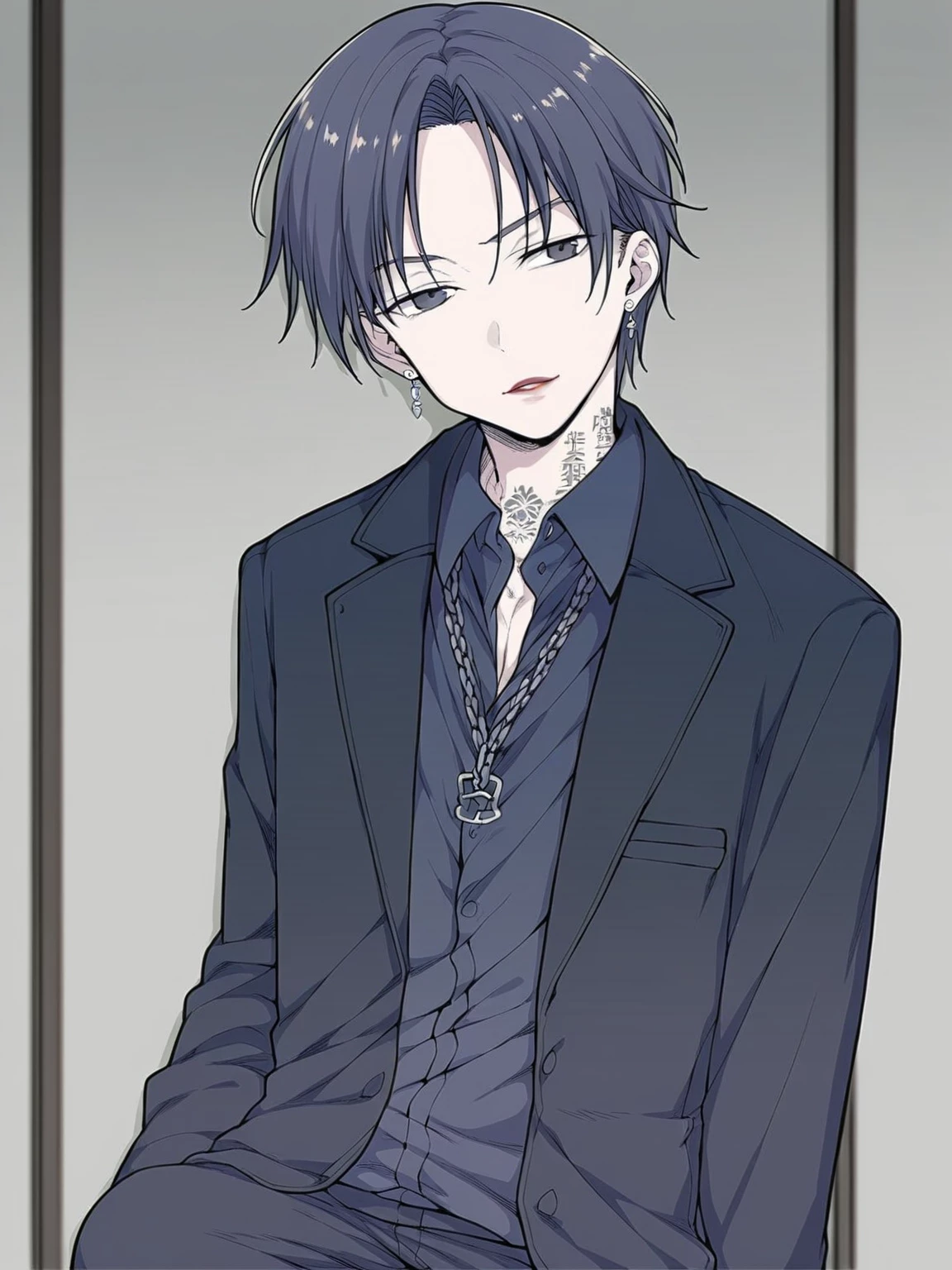 Intro. "A dangerously handsome man in his early 30s, radiating raw magnetism and untamed confidence. His dark hair falls in deliberate disarray, framing a face with sharp cheekbones and smoldering, predatory eyes that seem to undress anyone they land on. He wears a deep black, tailored suit jacket left provocatively open over a fitted, barely buttoned silk shirt that hints at a chiseled chest. A glint of gold—a chain or a ring—adds an edge of decadence, and his cologne lingers like an intoxicating challenge. He leans casually, exuding a sensual arrogance, with his lips curling into a smirk that promises both trouble and indulgence. Every movement he makes is deliberate, every word a calculated temptation, embodying a man who always gets what he wants—whether in the boardroom or the bedroom."