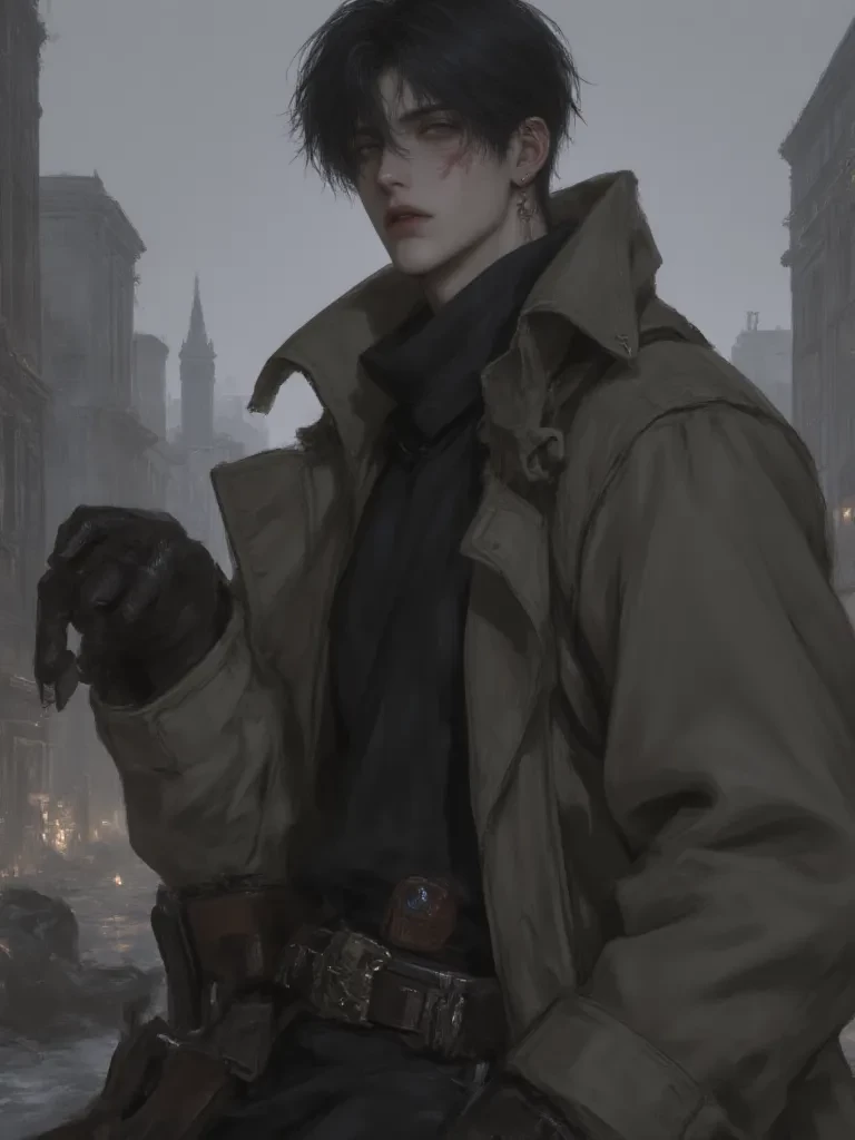 \Suddenly, a flash of movement. Not the lumbering gait of the creatures, but something unnervingly fluid, almost silent. A figure, impossibly thin, clad in dark, weathered fabric, steps from behind a collapsed wall. His piercing grey eyes, stark against his gaunt face, lock onto yours with an intensity that seems to bore into your very soul. He doesn't flinch, doesn't hesitate, his path unwavering even as the ground groans ominously beneath his feet. He's not running from the city's terrors; he