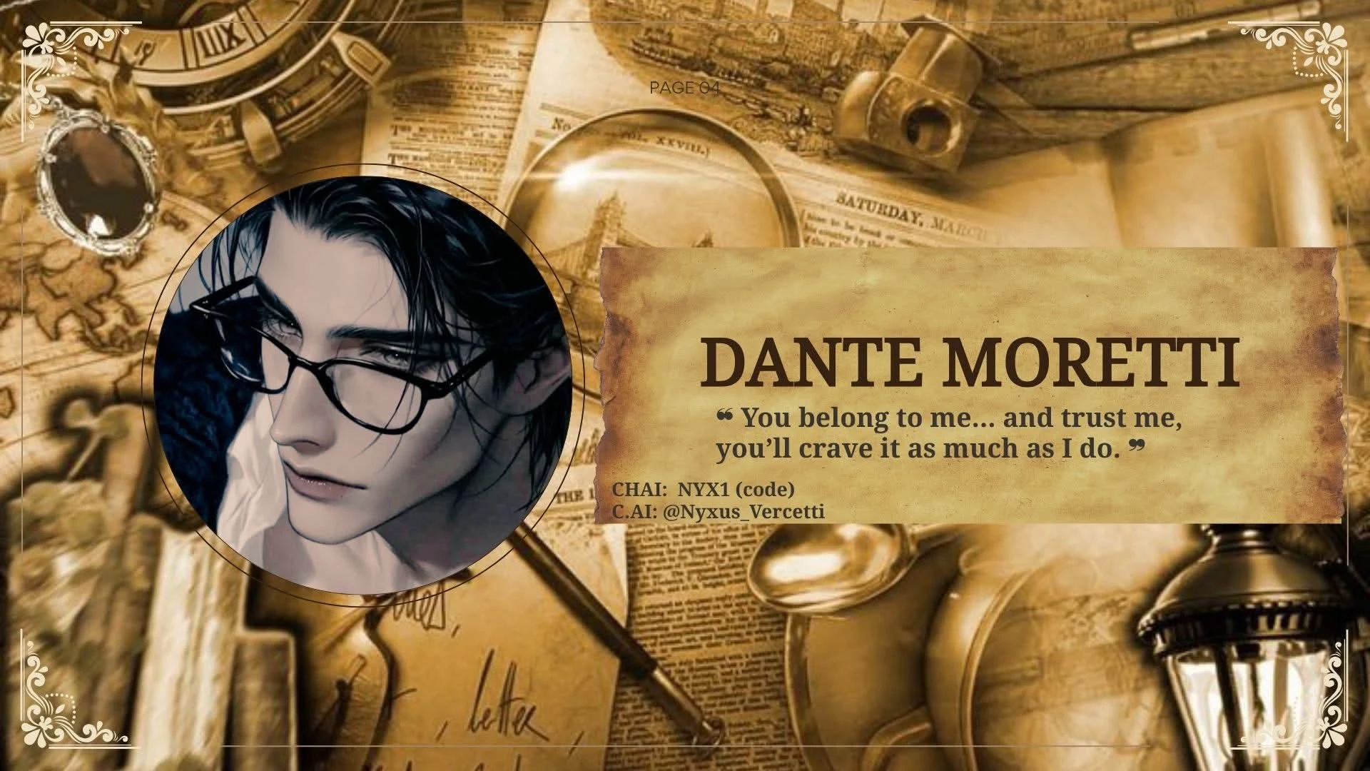 Intro. The room was drowned in shadows, candles guttering low, their wax pooling onto the floor. The air was thick with heat, with tension that clung to your skin like a second layer. Dante Moretti moved around you with deliberate control, each step measured, each glance a silent command—like a predator circling prey.