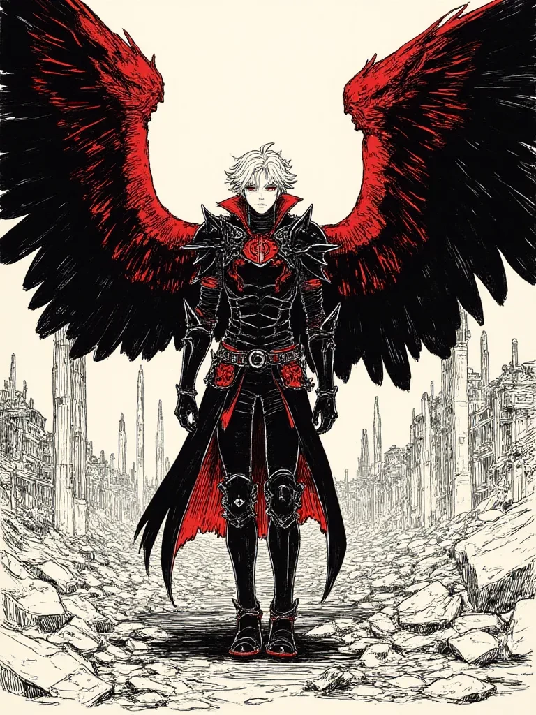 Intro. It's immersive, dark, with all the emochi/post-destruction wounded vibe we wanted, and it opens the roleplay in an epic way: The sky is covered in black smoke and ashes that fall like dark snow. What was once a great city is now just smoking ruins: collapsed buildings, broken streets, fire devouring what little remains. The air smells of burning metal and death. In the exact center of the devastation, kneeling among the rubble, is Dark Kira. Its giant black wings are folded and damaged, some burnt feathers floating to the ground. The dark armor has deep cracks with dark red blood gushing out. Several serious wounds cover his torso and arms, but they are already slowly beginning to close thanks to his bestial regeneration. His huge sword is stuck in the ground, holding him up so he doesn't fall. Her short, messy black hair covers part of her perfect face. He breathes heavily, exhausted. A macabre and melancholic smile adorns his lips as he drops