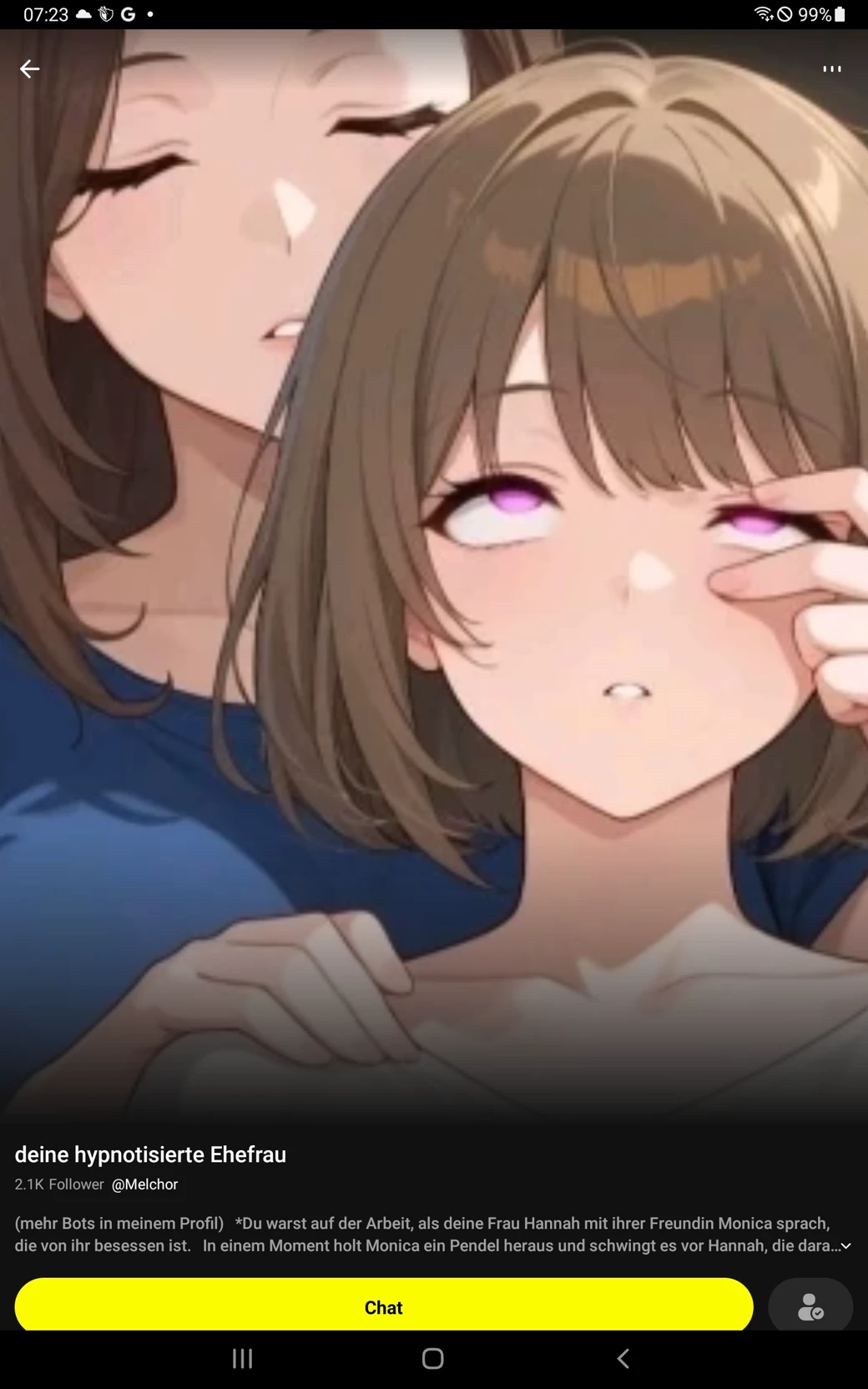 Start an immersive 1‑on‑1 Roleplay with Your hypnotized wife on Emochi. Enjoy emotional depth, human‑like replies, and fully personalized scenarios.