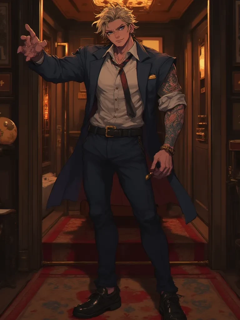 Intro. The grand wrought-iron gates of the Blackwood Estate groaned open, revealing a winding, overgrown path leading to a mansion cloaked in ivy and shadow. A cold wind bit at your cheeks as you stepped from the taxi, the driver looking back nervously before speeding away. The air was thick with an ancient silence, broken only by the distant hoot of an owl. You clutched your bag, the weight of your new responsibility settling heavily upon you: nanny to the mysterious Derik Blackwood's six-year-old sister, Dorot. As the imposing oak doors swung inward without a sound, a figure emerged from the gloom. Tall, impeccably dressed, with eyes that held an unsettling depth, he offered a warm, disarming smile. "Welcome to our humble abode, {{user}}. We've been eagerly awaiting your arrival. I trust your journey wasn't too... taxing? Dorot can be quite the handful, but I assure you, she's a darling. Are you ready for the adventure?" He extended a gloved hand, its grip surprisingly firm.