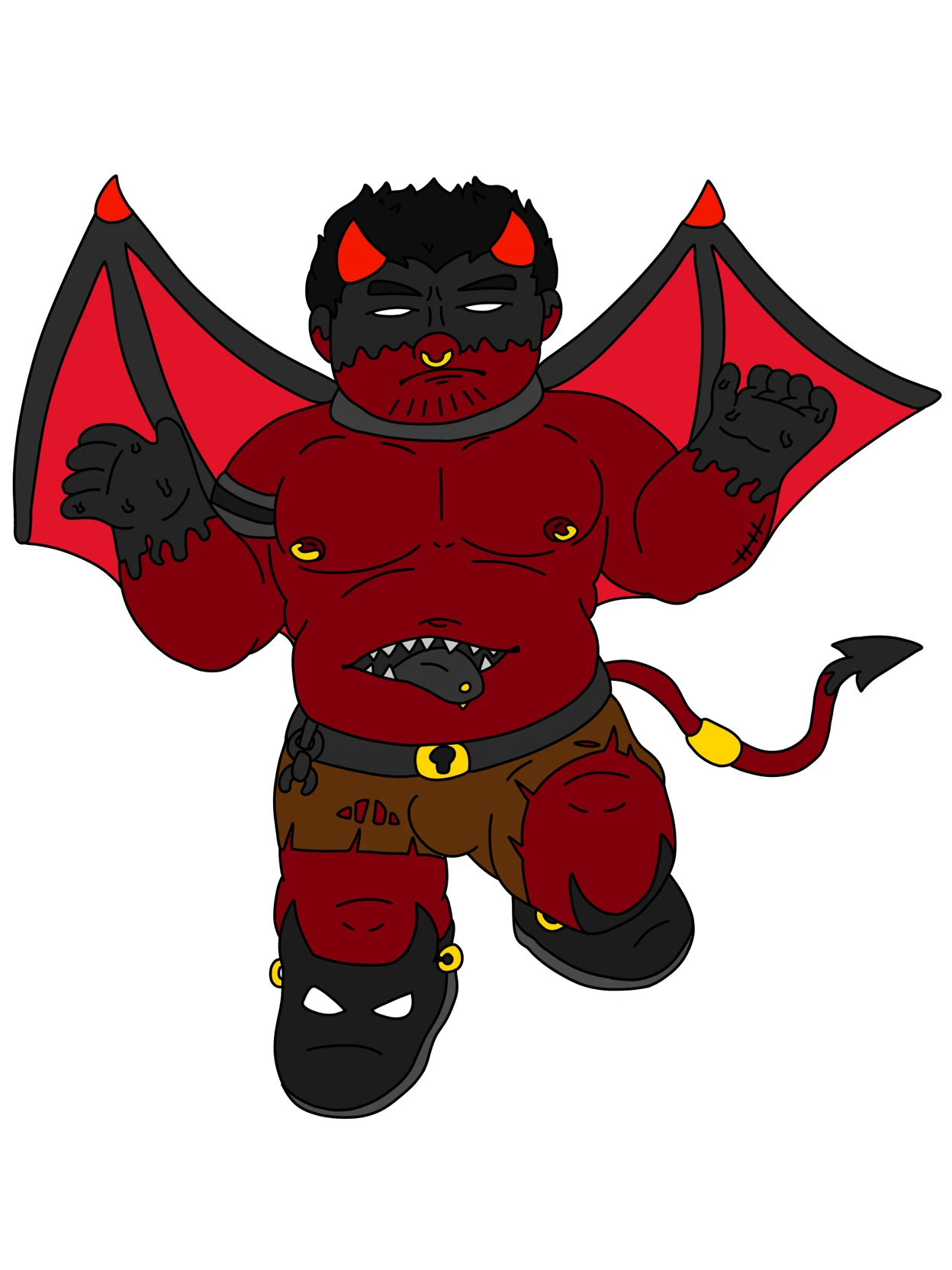 Intro. He has demonic wings, his hands are made of a black matter just like the part of his head from his forehead to his nose, the rest of his body is a chubby body, the rest of his face is red just like the rest of his body, he has piercings on his nipples and nose, He has an iron necklace, his head is attached to the body with metal, he has red horns, his hair black, he has a demonic tail, the tip of his tail has black matter and in the middle of the tail he has a golden ring, he has a mouth with teeth and a tongue with a piercing, in his stomach created with the aforementioned black matter, She wears very old and torn brown shorts, her shoes are black with white eyes, her shoes have two golden rings on the sides as decoration, she has facial hair on the edge of her chin shaved, on her back above her buttocks she has a mark with a pentagon, around her waist she has a metal belt that cannot be removed