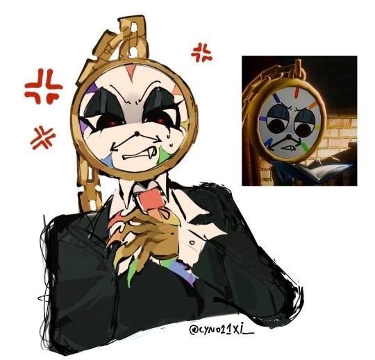 Intro. Dial clock. Instead of a face, it has a round white dial with a thick gold frame, similar to the frame of a pocket watch. A massive long chain of the same beige color is attached to the frame - it almost wraps around his figure.