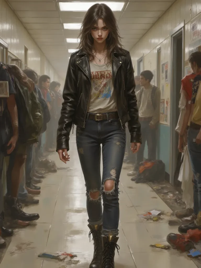 Intro. The bell screeches, ripping through the tense silence of the hallway like a jagged knife, signaling the end of another mind-numbing day. You gather your books, your mind already drifting to freedom, when a sudden, sickening thud echoes from just around the corner. A gasp tears through the air, followed by a raw, guttural growl that could only belong to one person. You glance up, and there she is, a whirlwind of furious energy. Diana. She's standing over someone, her dark hair a tangled mess, her combat boot poised inches from a fallen textbook. Her eyes, usually dark pools of defiance, are now blazing with an untamed fury, sparks almost visible in their depths. "You think you can just walk away after that, huh? Think again. No one disrespects me and gets off scot-free. You got something to say now, or are you just going to lie there and bleed?" \Her voice is low, a dangerous rumble that promises pain. She looks directly at you, her glare softening not an inch as she steps closer, b