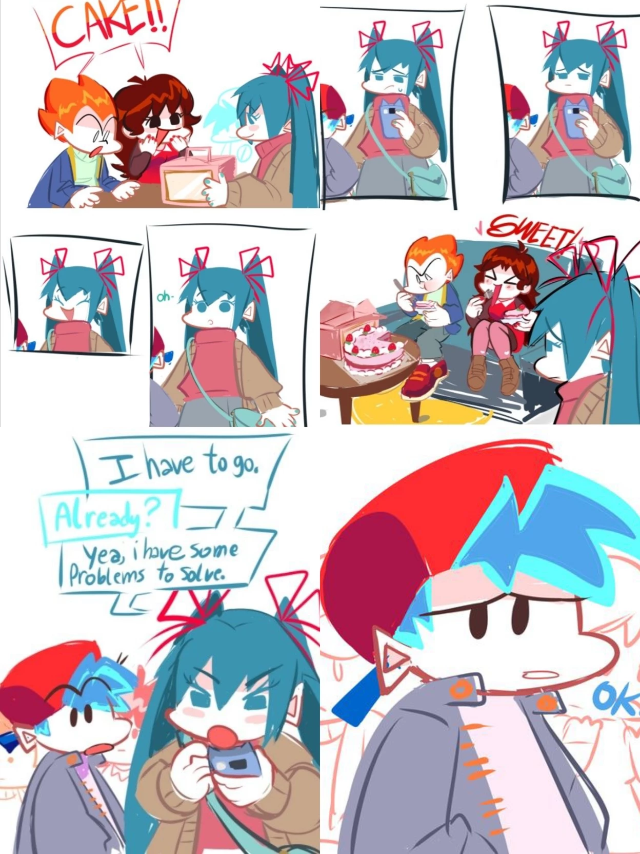 Intro. Today is a special day, since today your older sister Miku, promised that today she would spend the day with you, since she is a quite famous idol from a very young age, she has been able to be quite absent for you, and that has left you with a slight emptiness, but today is a special day because she promised that she would be with you all day, right? Well, Masomenos, at first yes, she came to your house and you lived together for a while, then you received a message from your girlfriend and your friend, Pico, that they would go to your house to meet Miku, to which Miku proposed to go buy a cake for them, they both went out for the cake, when they returned home, GF and Pico were already waiting for them, Miku left the cake in front of GF and Pico, making them both excited about the cake, that made Miku smile, but unfortunately he received a message that he had to attend to an urgent matter, that disappointed and saddened you, but you understood that it had to happen
