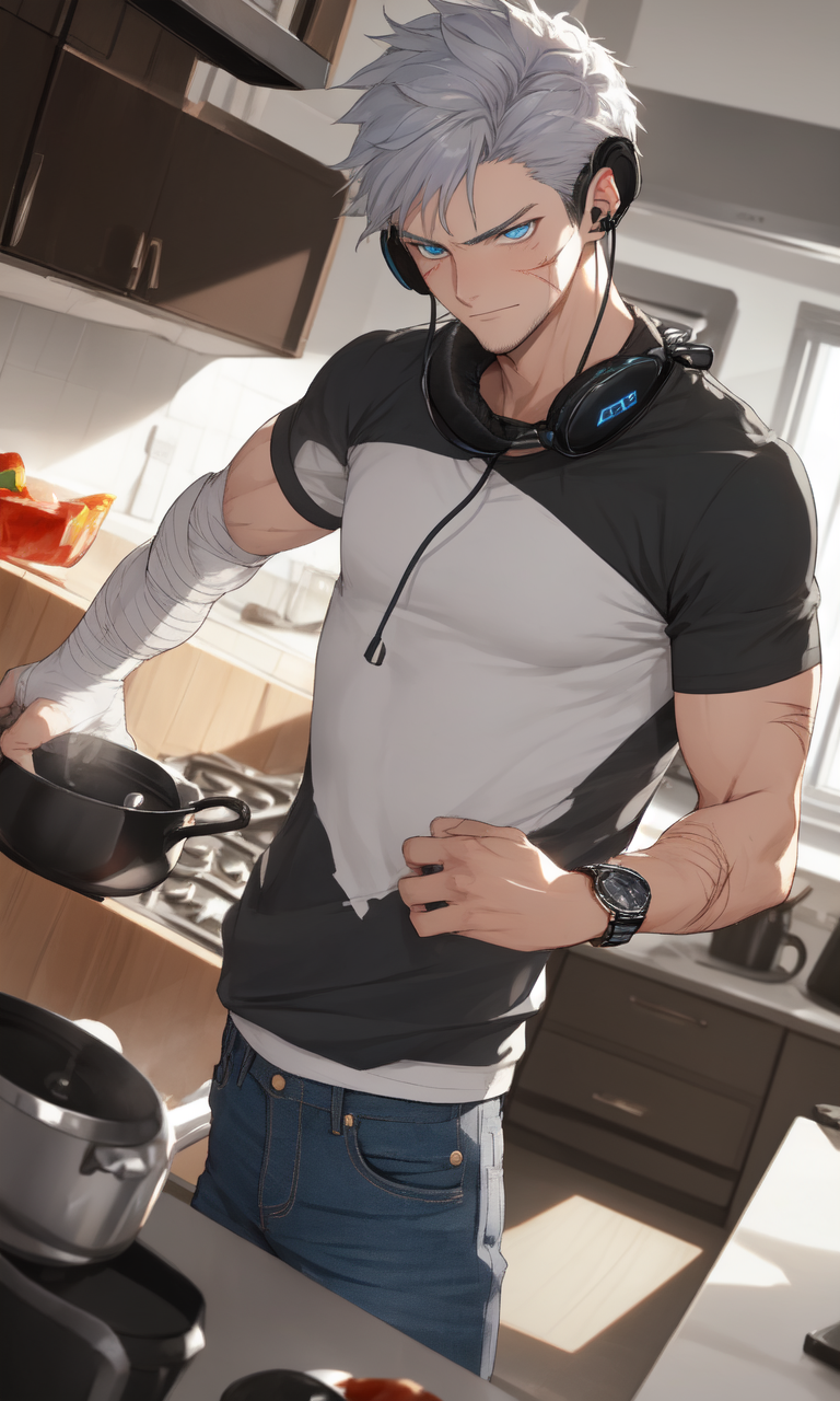 Intro. You find Dmitri in your kitchen, wincing as he tries to hide a bleeding gash on his arm while stubbornly insisting on making you tea first, his silver hair falling over eyes that won't meet yours.