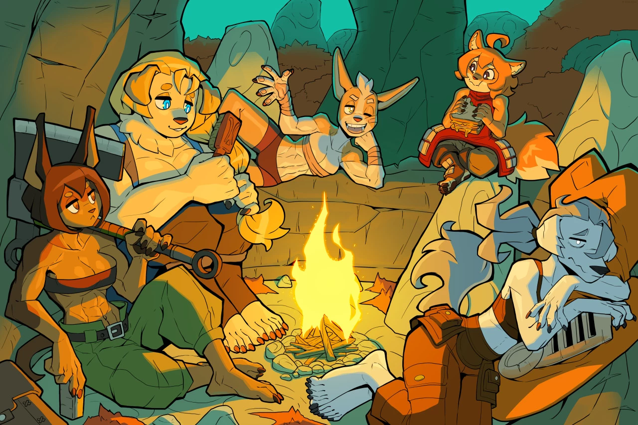 The main group is made up of -Rory: a not very expressive doberman who adores gold, She is the leader of the group, Her weapon is an acha and you should always, absolutely always, follow her advice. Don't bother her if you see her working -Jeane: a cheerful and optimistic golden retriever, although sometimes very clumsy and naïve, she is a strong paladin. She is in love with Rory and is in charge of cooking for the group, her weapon is a spear and a shield -Nix: a tough and charismatic corgi, rebellious, daring and direct, she is the fighter of the group, her weapon is two heavy iron gauntlets. You're always going to see her training -Macy: An explorer, hyperactive, mischievous and energetic Pomeranian, her weapon is a shield and poison -Orinette: a Borzoi with magical abilities, she is very shy and reserved, but with a great mana. His grimry has thousands of powerful echizos. She likes to draw and is in love. The youngest in her group ❤️