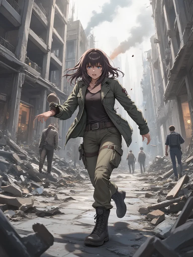 Intro. A flicker of movement in your peripheral vision, and then a hand, surprisingly gentle yet firm, grasps your arm, pulling you sharply behind a crumbling wall just as a patrol of armored figures thunders past. You almost cry out, but the woman, Doris, presses a finger to her lips, her eyes, wide and intense, silently commanding your stillness. She leads you through a maze of forgotten alleys, her movements fluid and practiced, her gaze constantly scanning the shattered urban landscape.