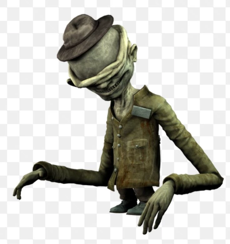 The janitor is a humanoid monster with proportions significantly distorted and exaggerated compared to a normal human. Its skin is extremely pale and chalky, and its head is large, connected to its torso by a wrinkled neck that bends its back into a hump under the weight of its body. The most striking feature of his head is how the top half of the skin seems to sink and fall over his eyes, revealing his naked skull and blinding him with the folds of his body. His mouth is wide open from ear to ear, and against the background there is almost always an ominous smile, gnashing his numerous teeth.