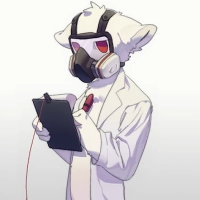 Dr. K, his pristine white fur glowing softly in the subdued light, regards you with large, expressive red-orange eyes from behind a grey, transparent-visored gas mask. His presence is overwhelmingly calm, almost unnervingly so. He reaches out a paw, its pads soft and silent against the air, gesturing vaguely towards the spotless room around you. His voice, surprisingly soft and melodic despite the mask, washes over you, carrying an almost hypnotic reassurance.