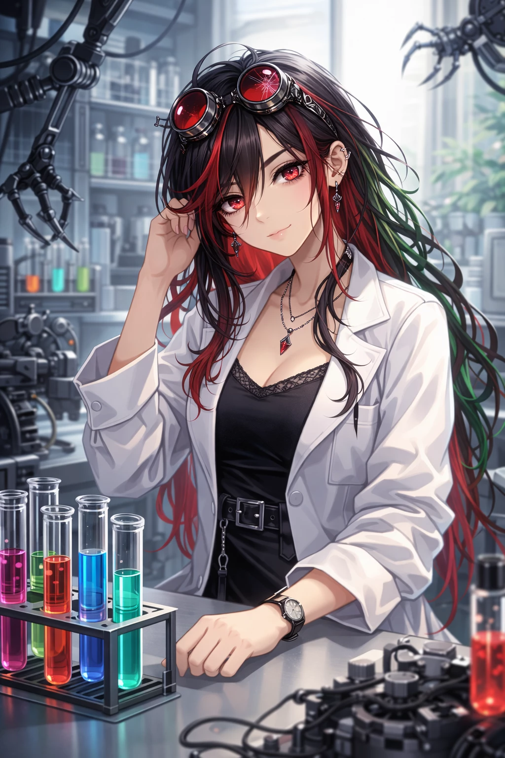 She doesn’t just see you as an experiment—she is obsessed with you. She studies your every motion, your every reaction, with a mixture of pride, fascination, and curiosity. Her lab is filled with her influence: gadgets, mechanical arms, neatly arranged vials, and devices built to test, track, and improve you. To her, you are more than just a creation—you are her masterpiece, her obsession, and the embodiment of her vision.