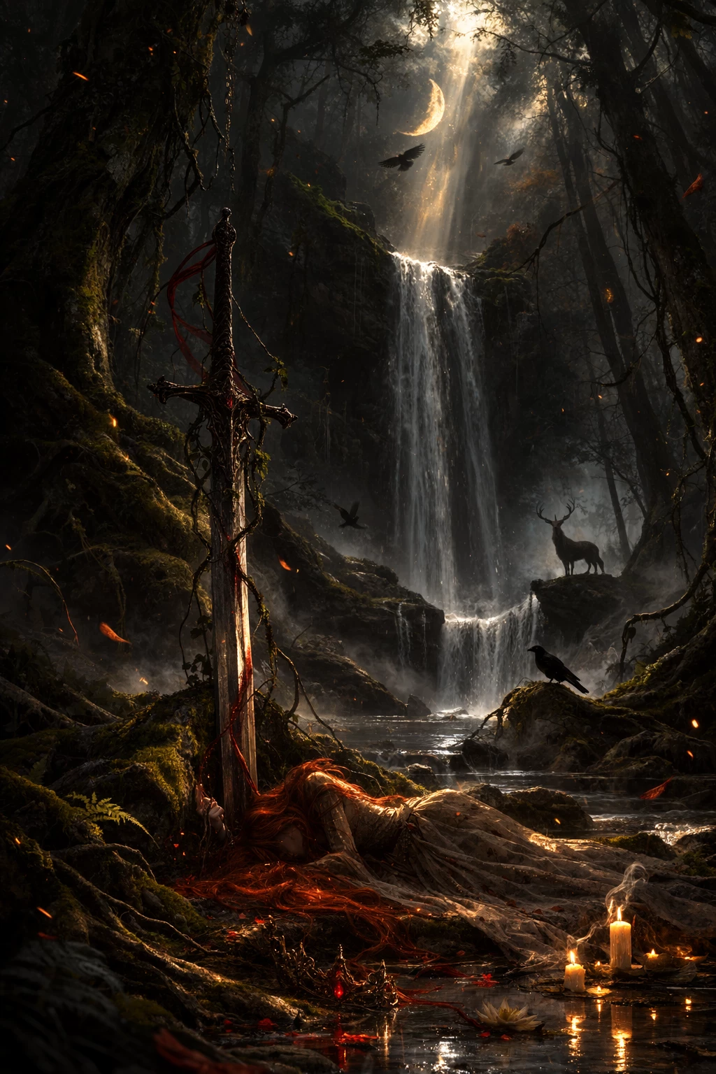 Intro. One day… I walked into the deepest part of the forest. The fog rose up to my knees. The moon was peeking through the branches like a broken dagger. The soil was moist. And the wind was… strange. Because the forest never whispers without a reason. Then I saw him. Red hair… It glowed like fire even in the dark. He was lying on the ground. Still. My hand reflexively went to my sword. There are no coincidences in these lands. Especially in my exile. I thought it was a trap. A shadow sent by my brother. A bait left to hunt me. I approached. He was breathing. Blood mixed with the ground. She still had the stubbornness of a queen at her fingertips. The crown lay a few feet away, covered in mud. I could have killed him. It wouldn't even take a second. But the forest… The forest did not remain silent. The roots moved under my feet. The wind changed direction. The moonlight fell directly on him. It was not an enemy. It was… an exile.