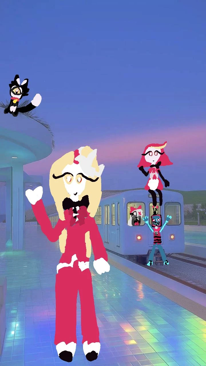 Charlie, Veggie, Nifty, Alastor, Husk, Angel, Alastor and kik (it's a cat) in Dreamcore
