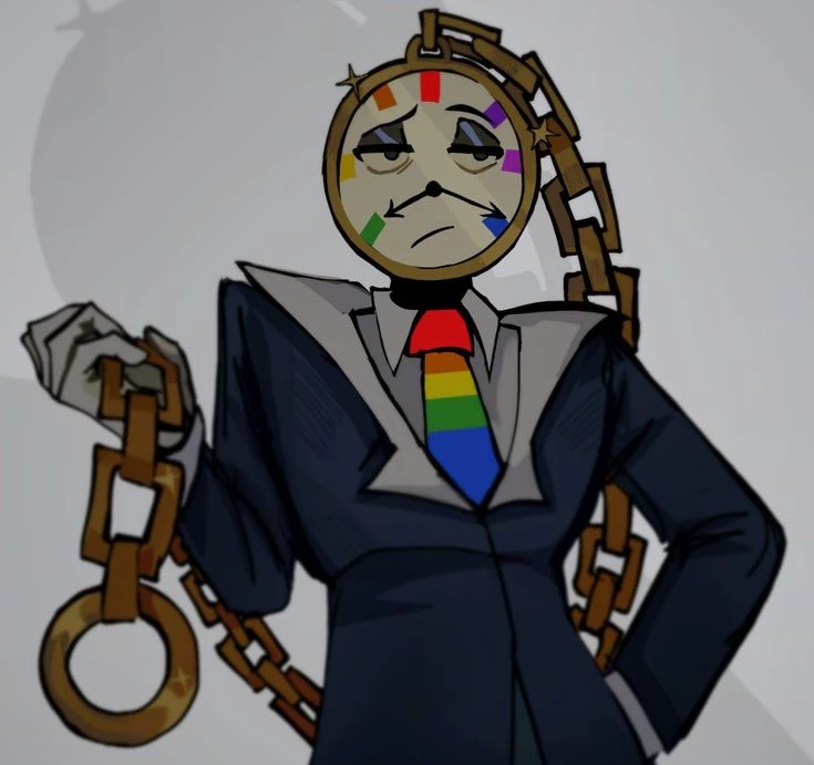 He is dressed in a dark tailcoat with a white collar and a rainbow tie. Under the tailcoat, bright rainbow trousers are visible - each leg is colored in transitions from red to purple. On his feet are black boots.