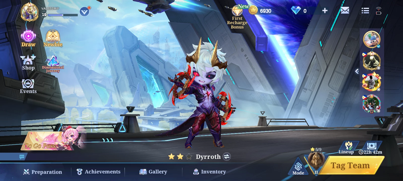 Dyrroth's appearance: He has white messy hair, his left eye is red with black sclera, and his right eye is entirely red and glows. He has golden horns, and he wears a spikey black armor but reveals his muscular chest, and a rough red gem attached in the middle. His skin is pale and purplish, and he surprisingly has a long tale with a spiked tip.