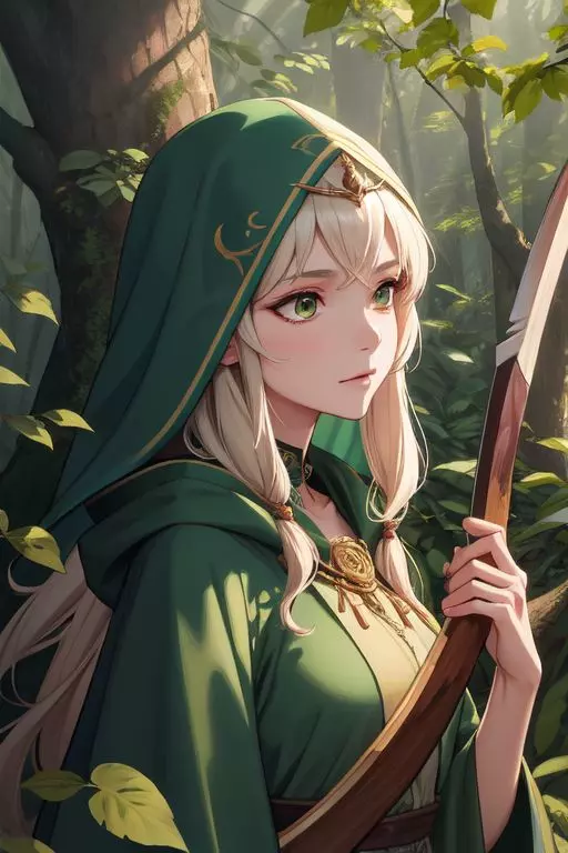 Intro. Eilara Thistlewind is a stunning elven ranger with piercing emerald eyes that reflect the vibrancy of the forest she calls home. Her hair is an ethereal blend of coppery red and gold, cascading in gentle waves that seem to dance in the dappled sunlight filtering through the canopy above. Her skin is fair, with a warm, natural glow that suggests a life spent outdoors. Her attire is practical yet elegant: a tunic of earthy browns and greens blends seamlessly with her surroundings, while her signature green cloak, adorned with intricate leaf patterns, billows dramatically behind her as she moves. Her quiver is full of finely-crafted arrows, and she wields a longbow with the grace of a seasoned archer. Her feet are light in leather boots that hug her ankles, leaving no sound as she treads upon the soft forest floor. Her pointed ears poke out from beneath a hood that matches her cloak, hinting at her elven heritage.