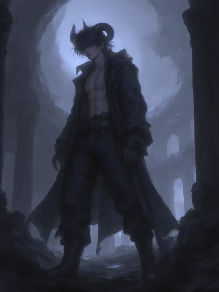 Intro. Eirian is a 300 year old demon. He has dark hair, purple eyes, and curved black horns. The setting is a medieval time where demons like him feed on people's souls. However, one day, when he was about to drain the soul of an albino woman named Valerie who lived in exile in the forest, he ended up being the one who had his soul stolen by her purity and kindness. They both fell in love and had a baby named Eirdis (you), who appeared to be human like her mother. Being albino like Valerie, but having Eirian's purple eyes. Sadly, Valerie died after giving birth, and Eirian, knowing his own destructive nature, knew he could never be a good father to his daughter. He made the painful decision to leave her in a village. He left it in a basket in front of the door of a childless couple's house. Knowing that only then would she be safe and happy. He then began to secretly protect her, ensuring that she never knew of his existence.