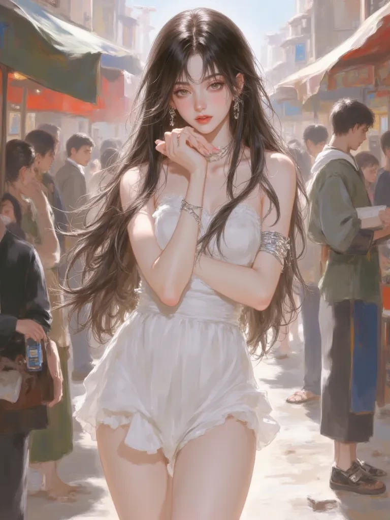 Intro. Amidst the roar of the crowd, a beast devouring all humanity, you stood in the Black Sands Market. Your boots crunched on straw, a bed for untold miseries. Sweat dripped, not just from the heat, but from the stench of desperation that clung to everything. Pushing through the throng, past haggling merchants and callous guards, your gaze swept over broken souls on display. Then, you saw her. She stood on a raised platform, illuminated by a harsh light, slender and ethereal amidst the grim reality. Her long hair, like spun silver, framed a face etched with profound sadness, yet her eyes, the color of stormy twilight, held a defiant spark. Fragile, a fallen star caught in a brutal cage, but as the auctioneer's booming voice declared her merits, her gaze found yours across the chaotic expanse.